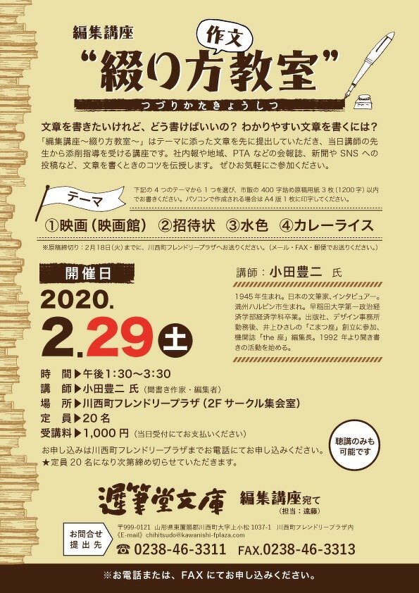 ※原稿締切り:2月18日(火)までに、川西町フレンドリープラザへお送りください。(メール・FAX・郵便でお送りください。)