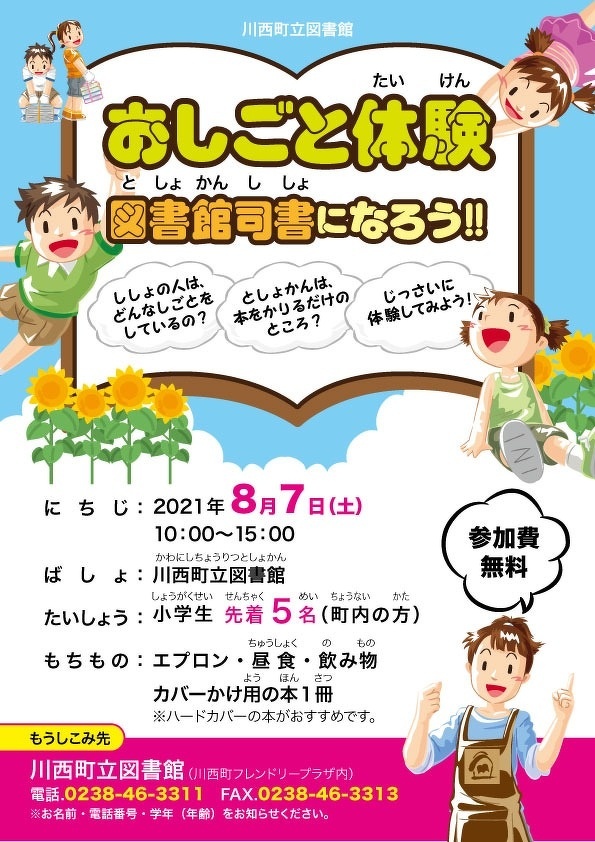 持ち物:エプロン、昼食、飲み物、カバーかけ用の本1冊(ハードカバーの本がおすすめです。)