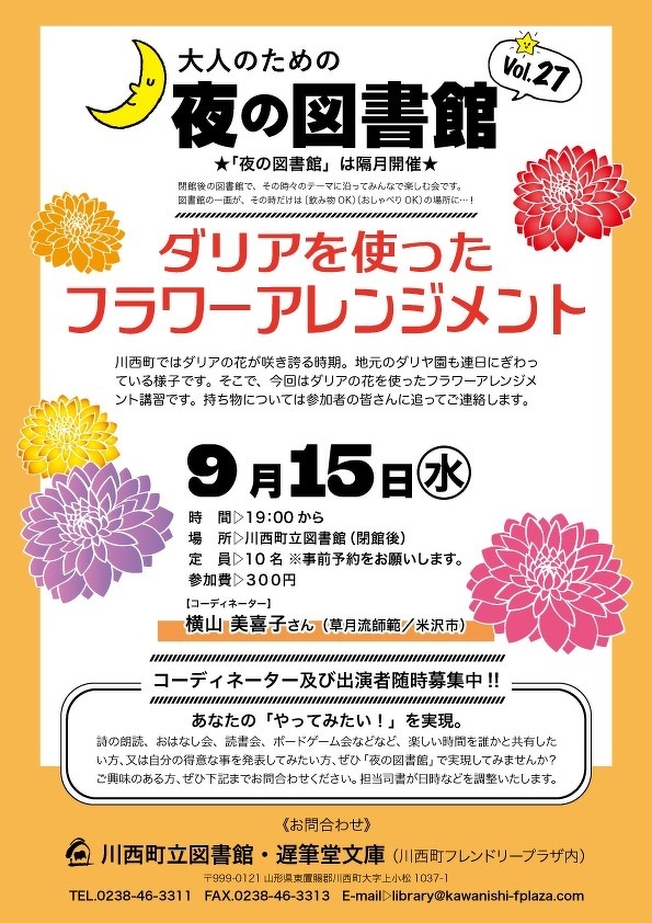 大人のための夜の図書館Vol.27ダリアを使ったフラワーアレンジメント川西町の花ダリアを使用します!