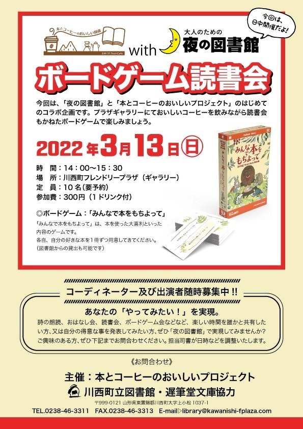 今回は、「夜の図書館」と「本とコーヒーのおいしいプロジェクト」のはじめてのコラボ企画です。プラザギャラリーにておいしいコーヒーを飲みながら読書会もかねたボードゲームで楽しみましょう。