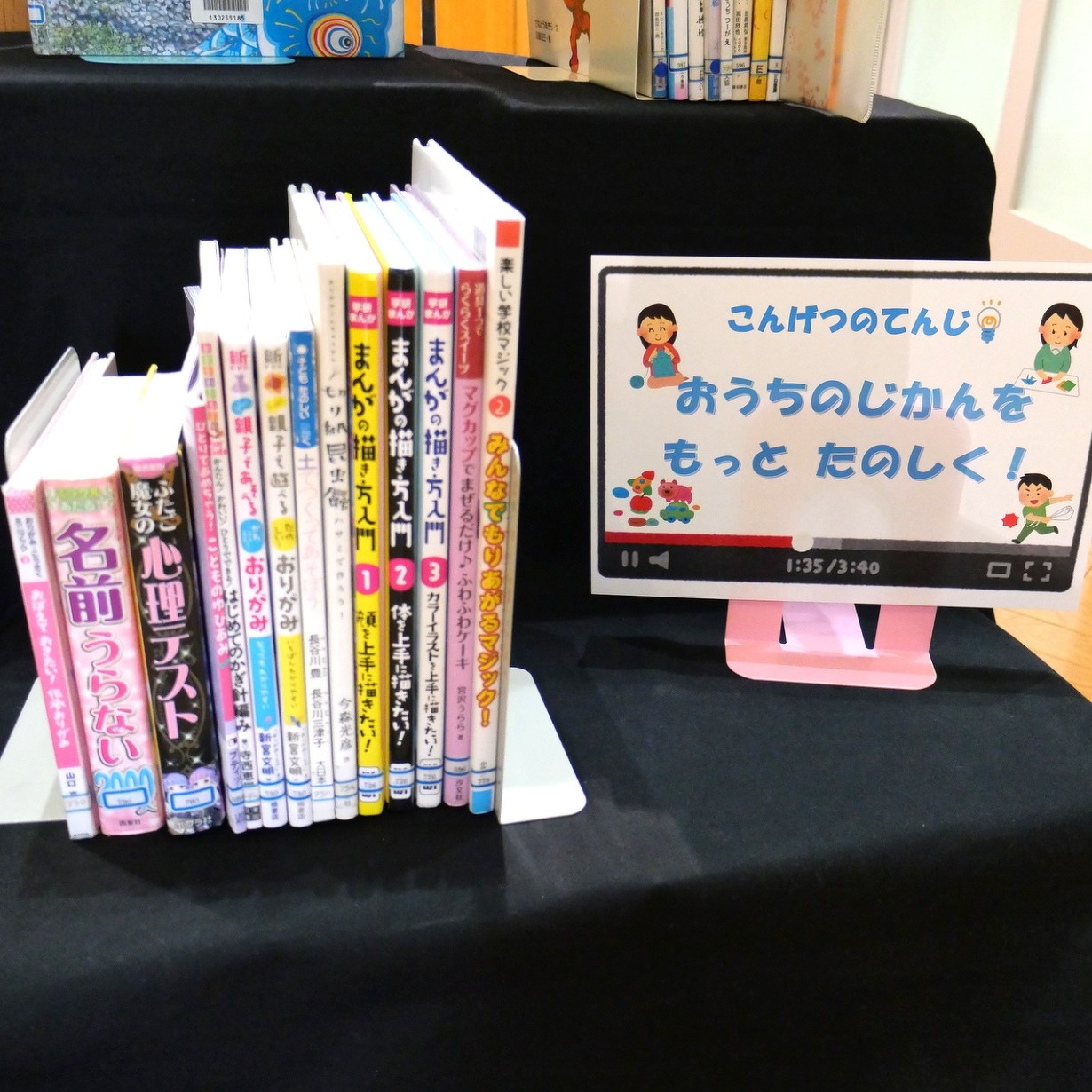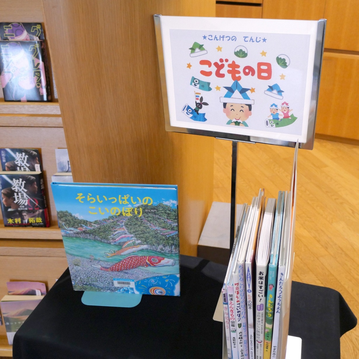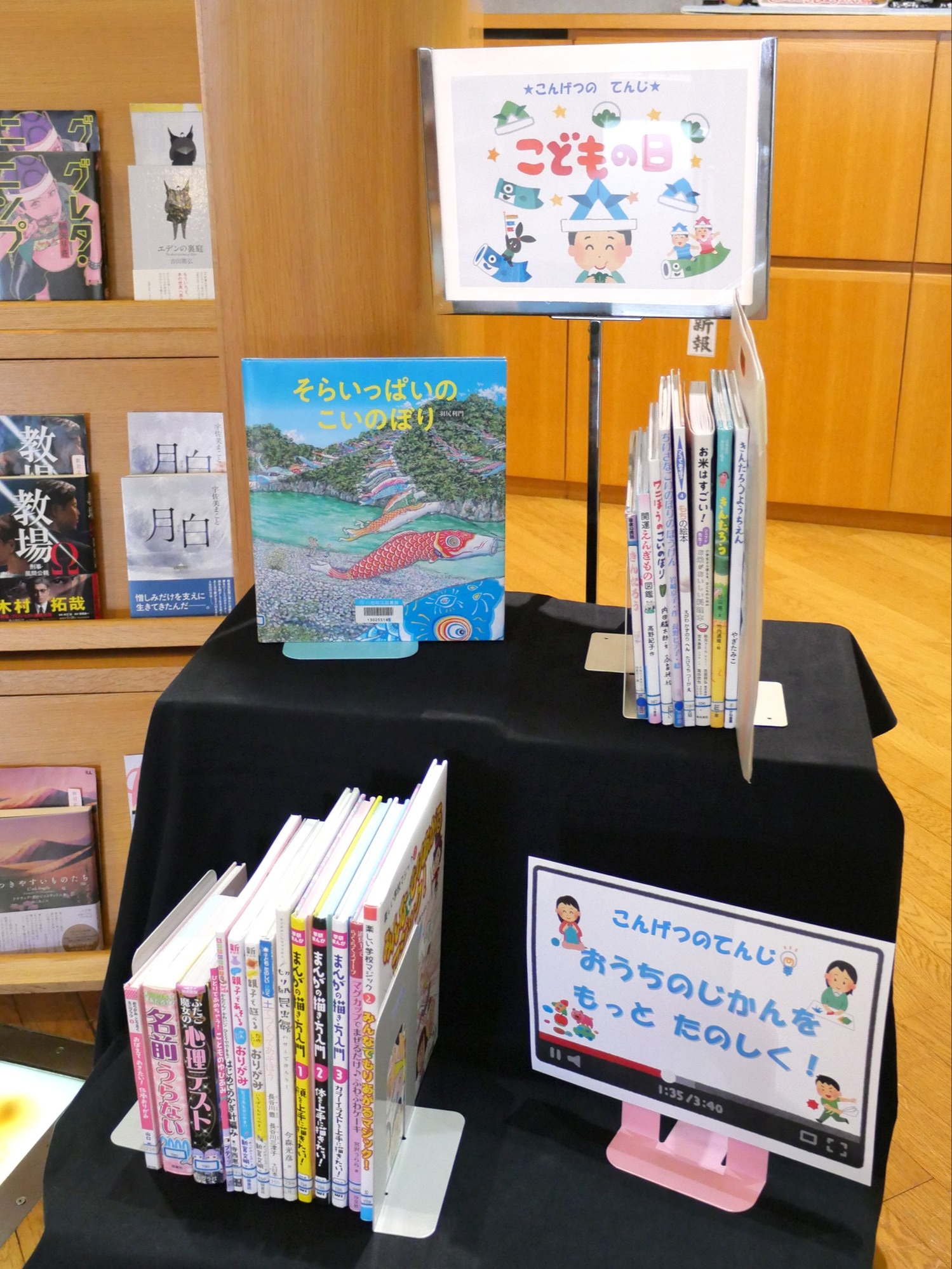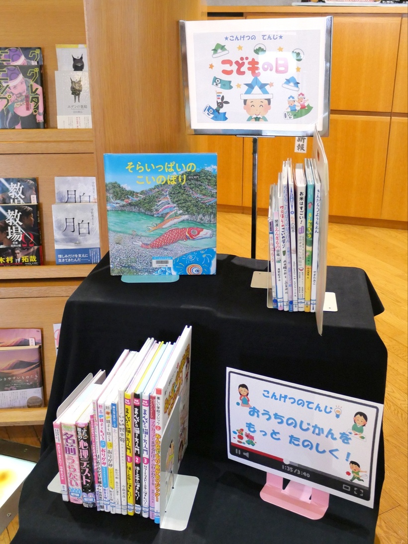 児童書コーナーは「こどもの日」特集と「おうちじかんをもっとたのしく」の2本立てです!