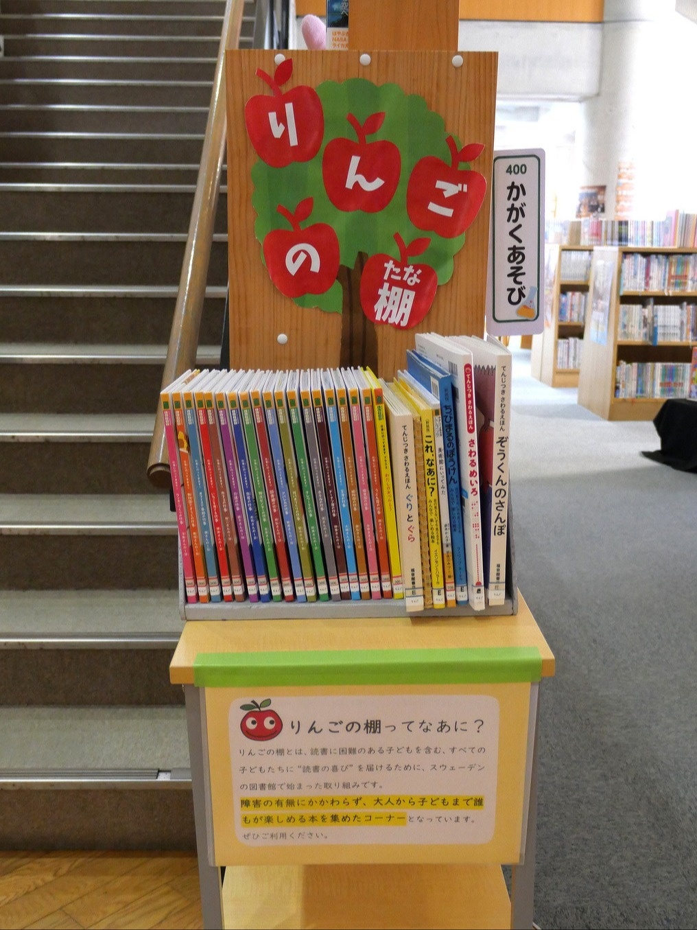 りんごの棚とは、読書に困難のある子どもを含む、すべての子どもたちに“読書の喜び“を届けるために、スウェーデンの図書館で始まった取り組みです。