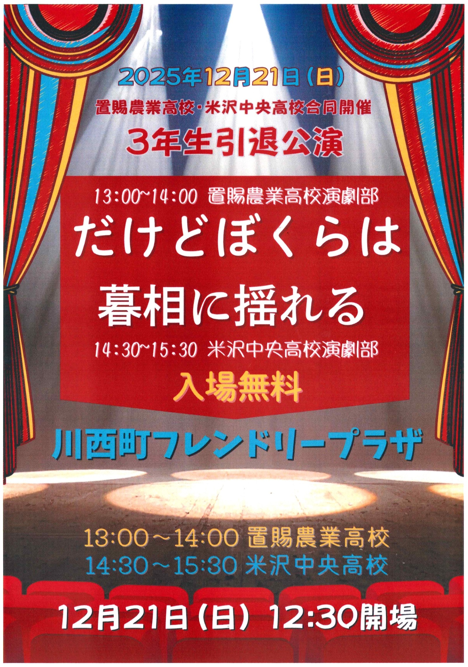 【お知らせ】置賜農業高校・米沢中央高校 合同引退公演 更新日:2025年11月18日(火) 置賜農業高校・米沢中央高校合同開催 3年生引退公演 だけどぼくらは 暮相に揺れる 開催日時 2025年12月21日(日)開場◆12:30 会場:川西町フレンドリープラザ 入場無料 13:00〜14:00 置賜農業高校 演劇部 14:30〜15:30 米沢中央高校 演劇部
