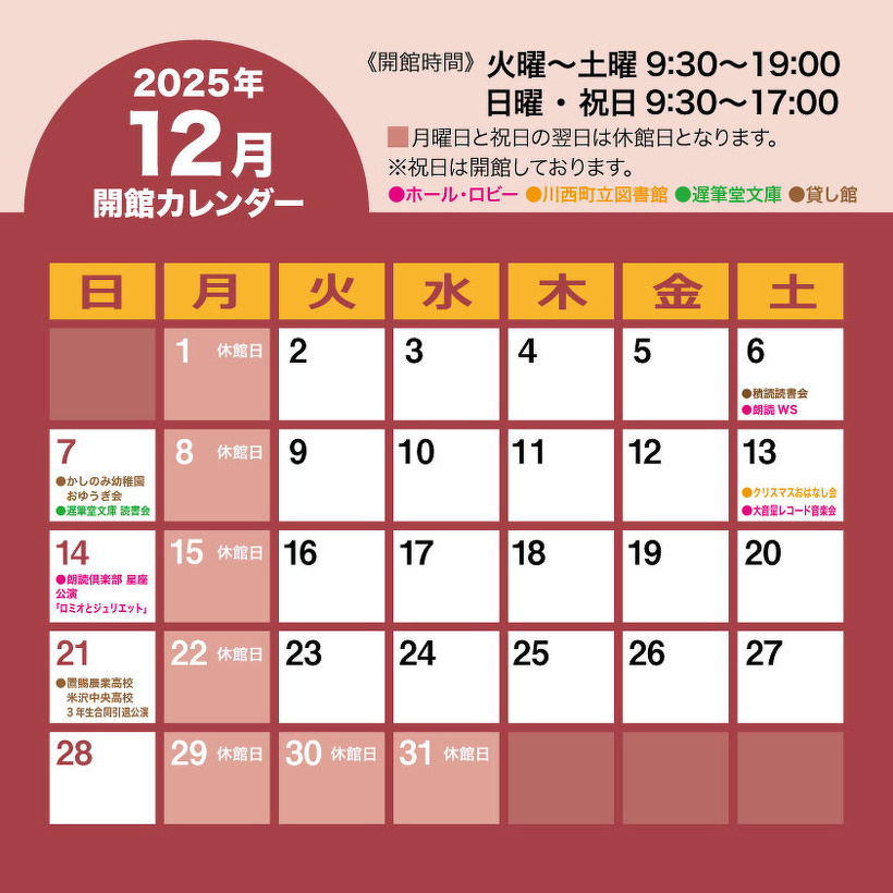図書館開館時間(土曜日◆9:30〜18:00、日曜日◆9:30〜17:00)