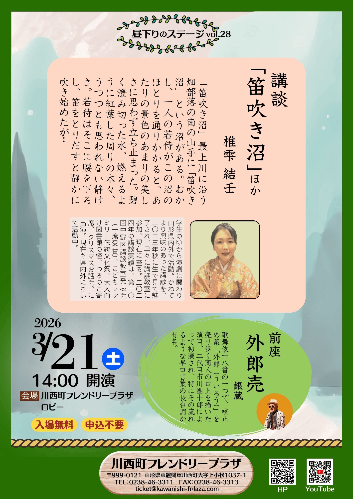2026年3月21日(土)昼下りのステージvol.28講談「笛吹き沼」 ほか