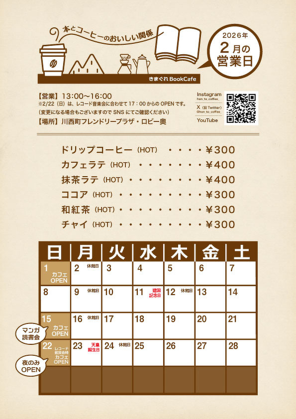 《きまぐれBookCafe》2026年2月の営業カレンダー