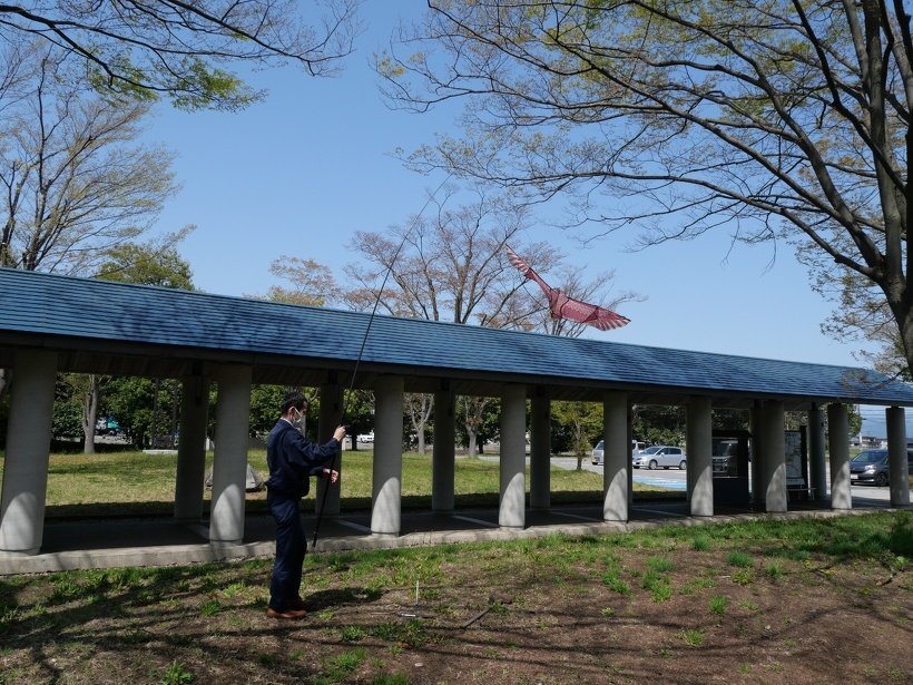 職員が組み立て、ハンマーを使い設置完了! 少し早い時期からの登場ですが、今年も期待大です。