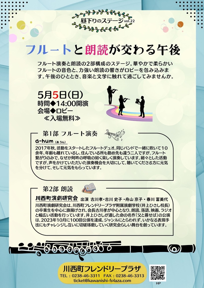 昼下りのステージvol.22「フルートと朗読が交わる午後」 更新日:2024年05月05日(日) 昼下りのステージ終了いたしました。 多くのご来場ありがとうございました! a-humと川西町演劇研究会のみなさま、素敵な午後のひとときをありがとうございました。