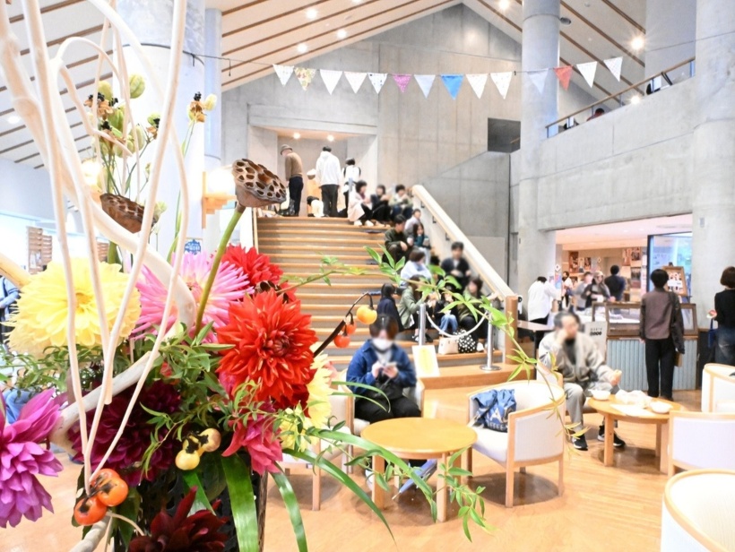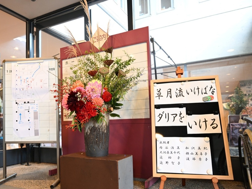 正面玄関では、花愛好会さんによる「草月流いけばな〜ダリアをいける〜」がお出迎えです。