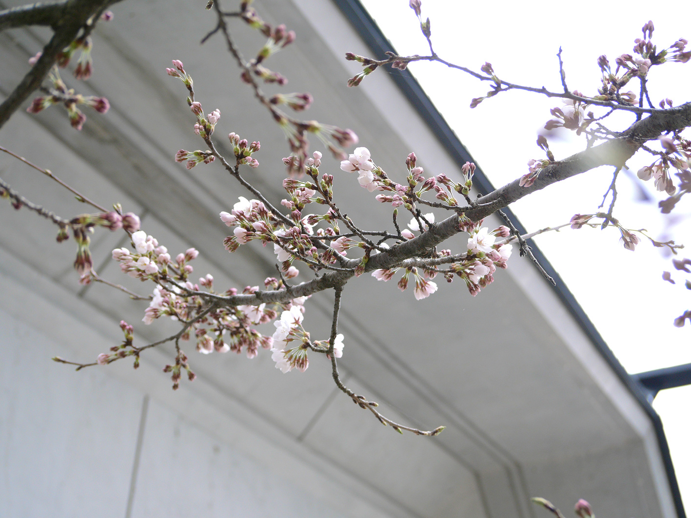 そして、今日(4/7)プラザ周辺を散策したところ、プラザ駐車場の端にある若木の桜が開花しておりました!