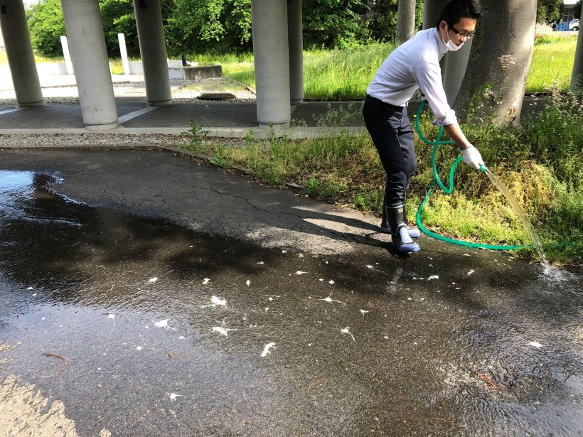 このところ、スタッフの一日の仕事は、デッキブラシで白い糞を洗い流すことからはじまる。
