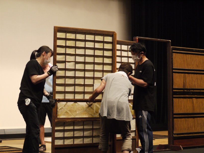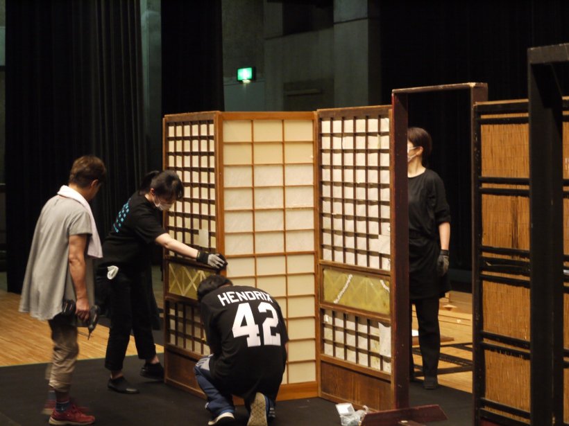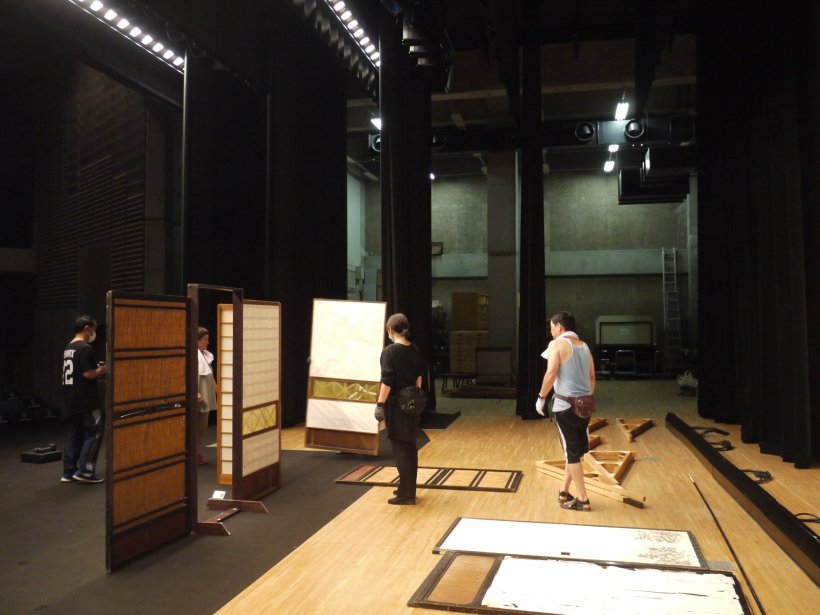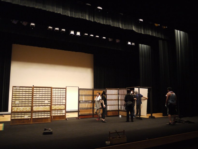 到着早々に出演者、スタッフが集まり車から舞台上へ次々とものを運んでいきます。襖、テーブル、小道具など多数。舞台上ではパンチカーペットを敷き、その上にセットが組み立てられいきました。何もなく殺風景だった舞台上が、立体的に形作られていくその光景は圧巻です。そして休む間もなく、音響・照明テスト、場当たりと続いていきます。