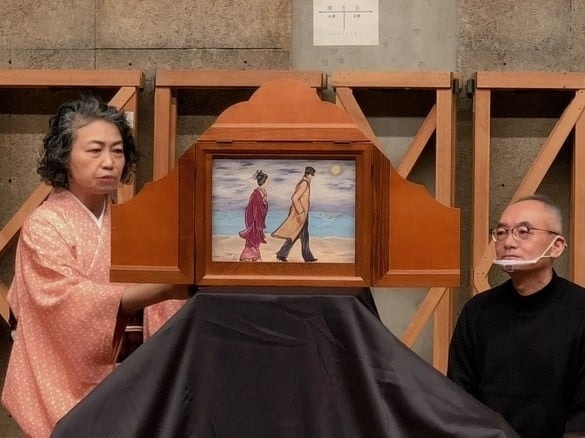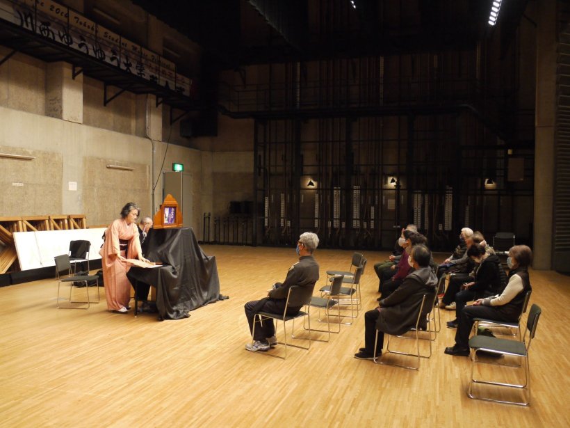 ウォーキングの後は、大人の紙芝居『金色夜叉』と『続・金色夜叉』の2本立てを鑑賞。朗読は、朗読倶楽部「星座」の金子聡子さんとプラザの栗田政弘が担当。カホン、シェーカーを使い効果音を入れる工夫をしています。