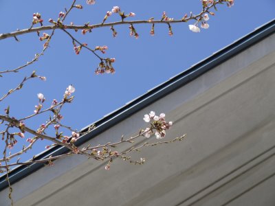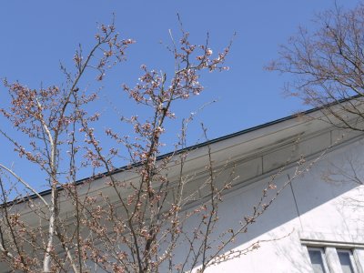 今朝、吉里吉里忌に向けてのゴミ拾いの最中に、プラザ東側の桜が開花しているのを発見しました。