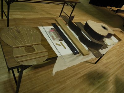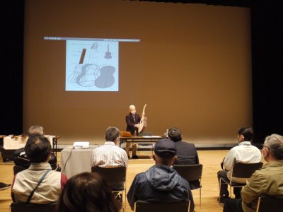 講師は川西町の玉庭に工房をかまえる、浜崎 浩さん。ギター製作を始めたきっかけや川西町の玉庭に移住された経緯などのお話から、実際にギターのパーツを手にギターが形になるまでの説明をしてくださいました。木を削ってはまた削りと、木からパーツを作り出す過程、そしてそれを組み合わせて形にしていくその職人技。話を聞いただけで根気のいる作業だとわかります。「ただ、こうして好きなことができるのは、家内のおかげ」と奥様への感謝を口にされていたのも印象的でした。