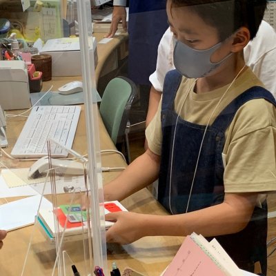 カウンターでの本の貸し出し業務や返却業務をはじめ、本の並べ方や除菌の仕方を興味深く聞いていました。