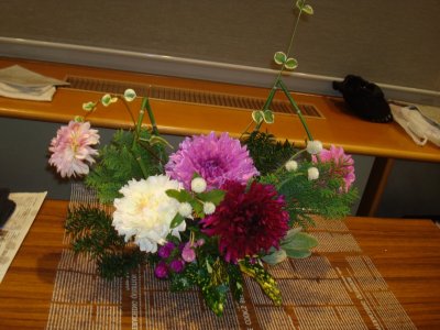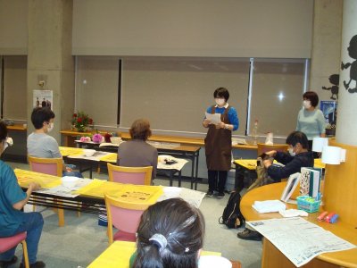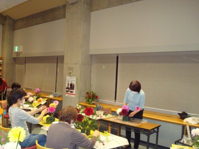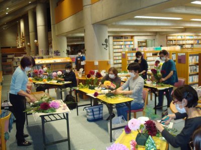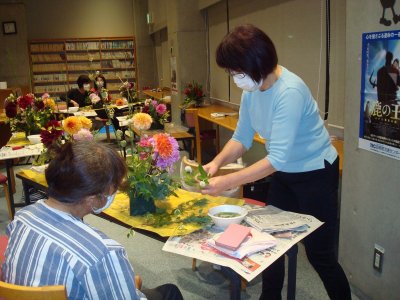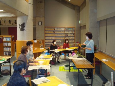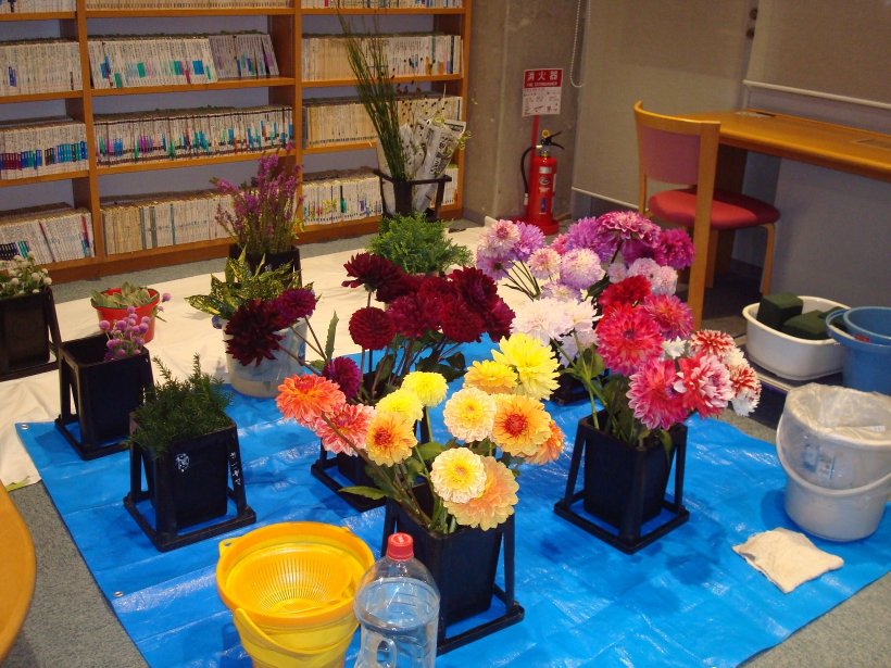 9月15日(水)図書館閉会後の午後7時から‘夜の図書館vol.27’「ダリアを使ったフラワーアレンジメント」が開催されました。講師は華道教室を開いていらっしゃる横山美喜子さん。ダリア園さんとハーブ園さんに花材をご提供いただき、参加された9名の方はそれぞれの好きなダリアと草花で思い思いに活けられ、楽しいひとときを過ごしました。