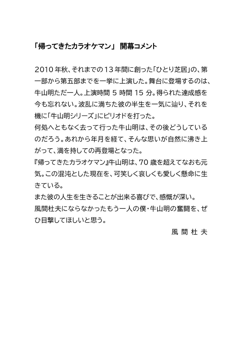 1997年「旅の空」から2010年「風間杜夫ひとり芝居五部作一挙上演!」まで、日本をはじめ、スペイン・中国・韓国・アメリカ・ルーマニア・ハンガリーと、世界を股に掛け上演された、風間杜夫ひとり芝居の「牛山明シリーズ」。
