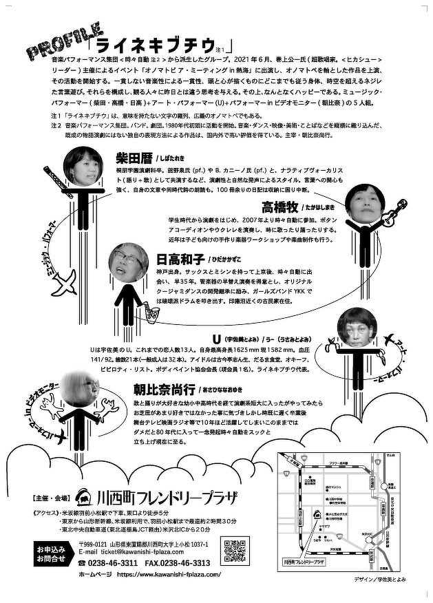 ※「時々自動」は、音楽パフォーマンス集団。バンド。劇団。1980年代初頭に活動を開始。音楽・ダンス・映像・美術・ことばなどを縦横に織り込んだ、既成の物語演劇にはない独自の表現方法による作品は、国内外で高い評価を得ている。主宰・朝比奈尚行