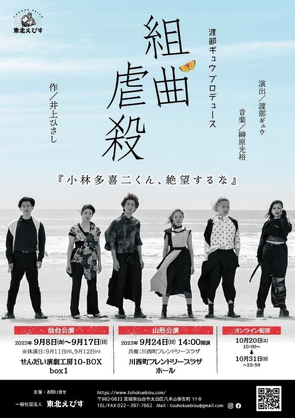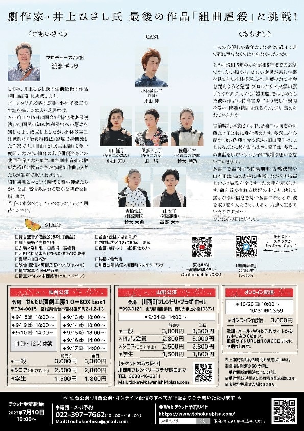 2010年12月16日に国会で「特定秘密保護法」が、国民の知る権利侵害への懸念を残したまま成立しましたが、小林多喜二は戦前の「治安維持法」違反で拷問死した作家です。「自由」と「民主主義」を今一度問いながら、仙台の若手俳優たちとの共同作業となります。また劇中音楽は榊原光裕氏と役者たちが協働で作曲。役者たちが生声で歌い上げます。 昭和初期と今という時代を若い俳優たちがつなぎ、感情あふれる豊かな舞台を目指します。