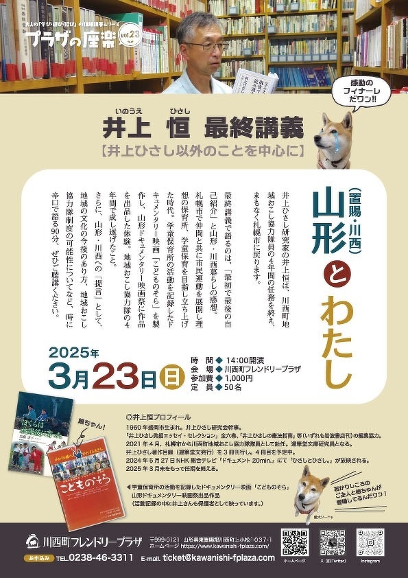 さらに、山形・川西への「提言」として、地域の文化の今後のあり方、地域おこし協力隊制度の可能性についてなど、時に辛口で語る90分、ぜひご聴講ください。