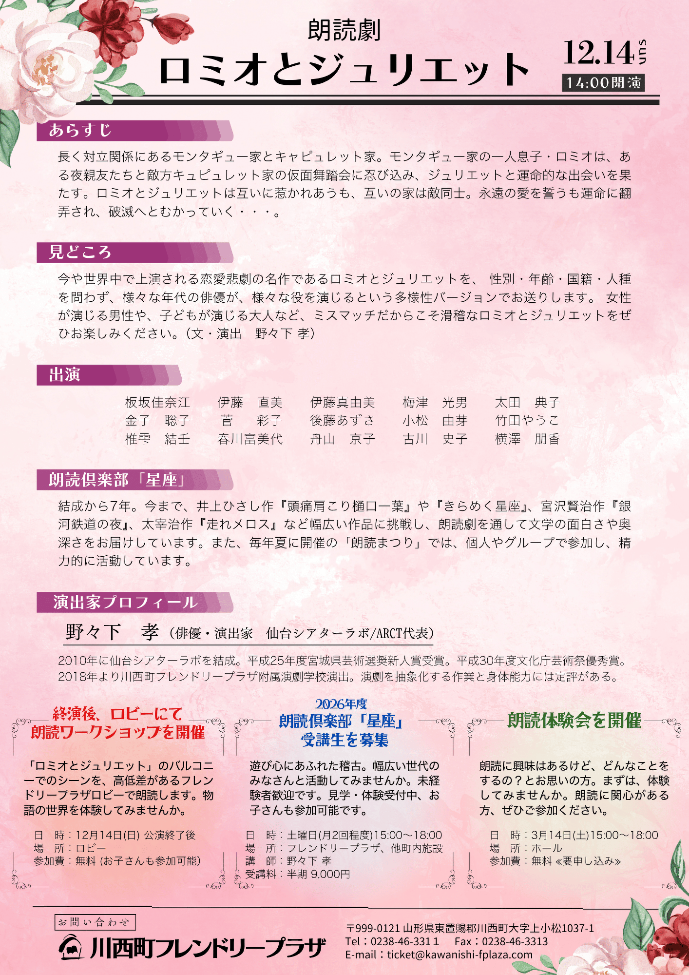 今や世界中で上演される恋愛悲劇の名作であるロミオとジュリエットを、性別・年齢・国籍・人種を問わず、様々な年代の俳優が、様々な役を演じるという多様性バージョンでお送りします。女性が演じる男性や、子どもが演じる大人など、ミスマッチだからこそ滑稽なロミオとジュリエットをぜひお楽しみください。(文・演出 野々下 孝)