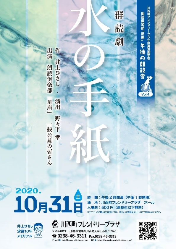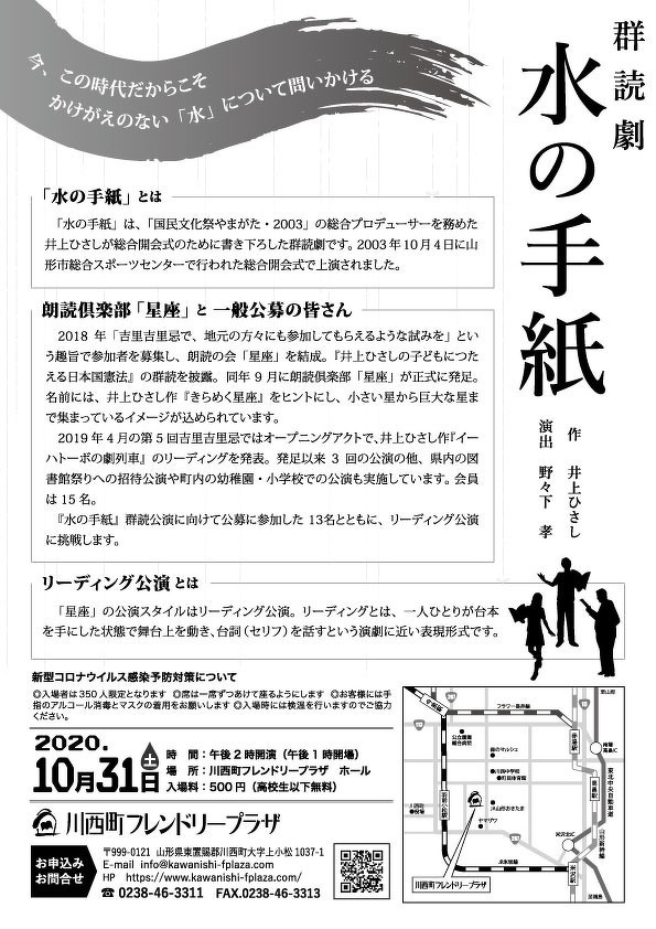 「水の手紙」は、「国民文化祭やまがた・2003」の総合プロデューサーを務めた井上ひさしが総合開会式のために書き下ろした群読劇です。