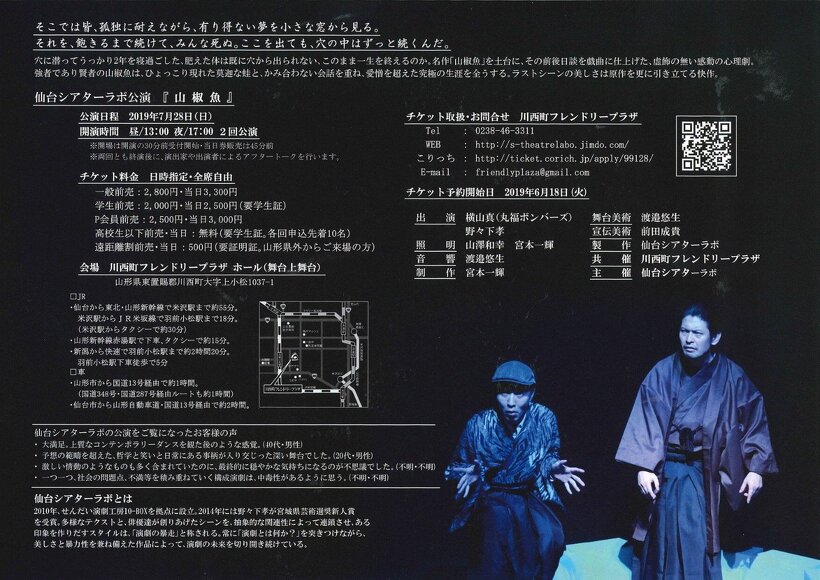 穴に潜ってうっかり2年を寝過ごした、肥えた体は既に穴から出られない、このまま一生を終えるのか。名作「山椒魚」を土台に、その前後日談を戯曲に仕上げた、嘘飾の無い感動の心理劇。