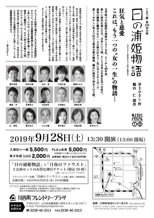 日の浦姫に清廉さと妖艶さを兼ね備えて観客を魅了する朝海ひかる、稲若に若手演技派として注目を集める平埜生成、説教聖に井上作品に欠かせないこまつ座の辻萬長、三味線弾きの女にその存在感で舞台を席巻する女優・毬谷友子を迎え、たかお鷹ら文学座の俳優たちも集結。